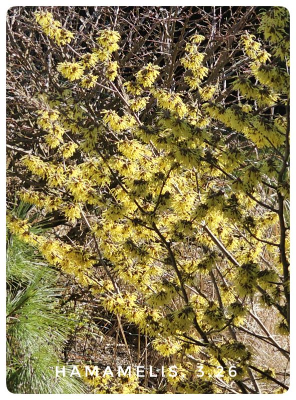 Uns geht’s gut und wir freuen uns ander Natur um uns. Auch das Wetter meint es gut mit uns, die Sonne tut allen gut. Überall fängt es an zu blühen, hier mal ein Blick auf unsere Hamamelis